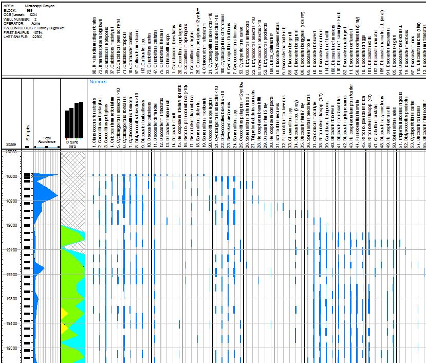![]() | Various Curves This is a section of a typical chart showing a variety of features. From left to right: scale column, graphical lithology, sample list, total abundance column (blue), compact multiple curve, scale column, sample list, taxon abundance with two different fossils superimposed, sawtooth style taxon curve, butterfly style taxon curve, and finally a scale column. The user can put an unlimited number of columns of any type, in any order. | |