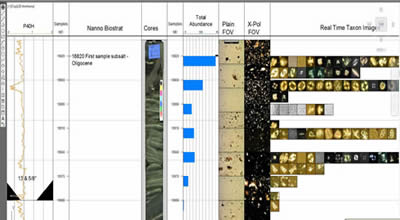 Embedded Images Chart BugCAD can automatically embed digital images into your drawing. Simply save the image into a folder with the sample depth included in the filename. In this drawing a conventional core is shown, along with fields of view from the microsope in both plain light and x-pol light. Organic material shows up well in plain light, and calcite illuminates in x-pol. Fossils from each sample are photographed, saved into a folder and listed at the appropriate downhole position on the chart. Click on the image to view a PDF with a zoomable, high resolution version of this drawing. |